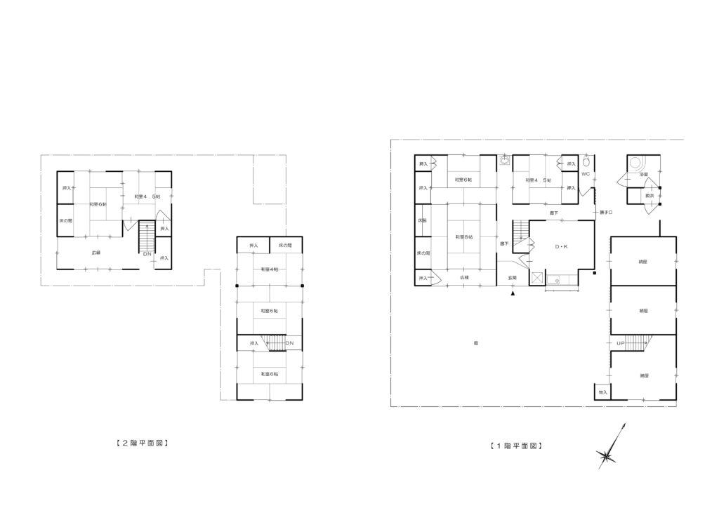 離れに浴室もあり、間取りは5DK+納屋上3室と部屋数も多い物件となっております。